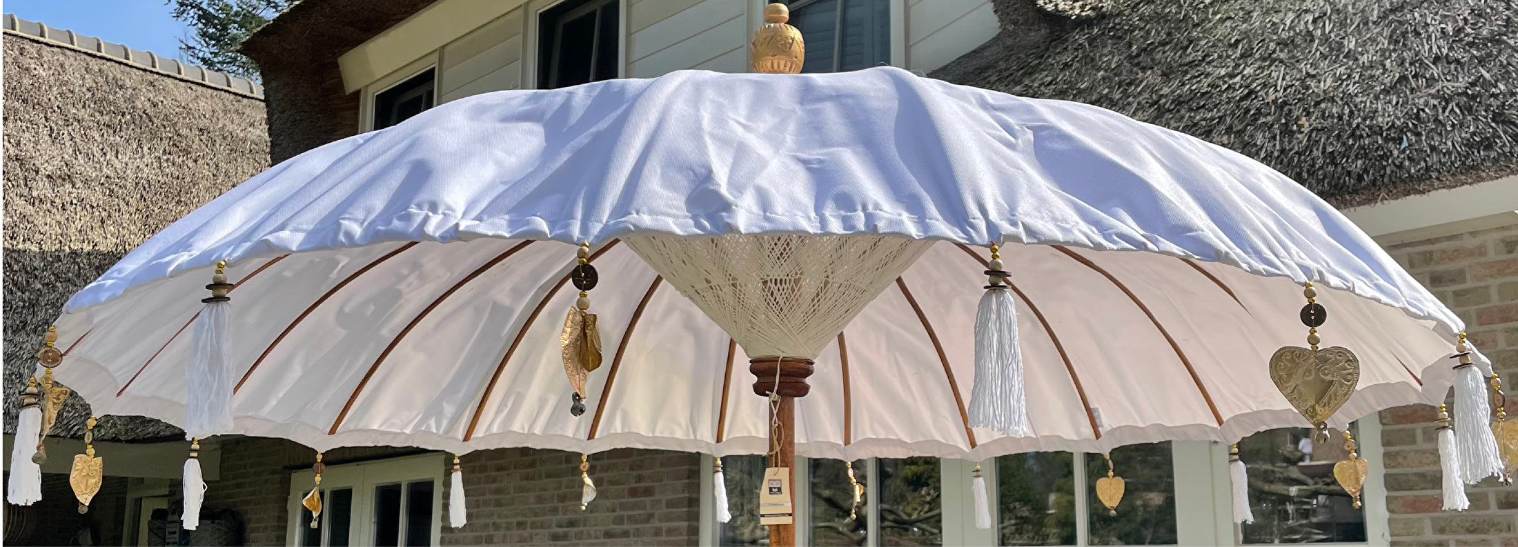 Ibiza Parasol 2 meter wit/goud boho (steel in 2 delen)