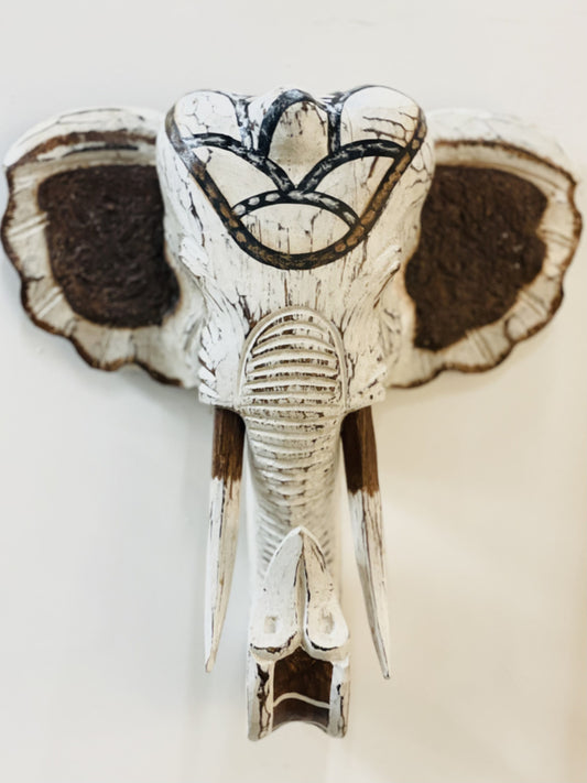 Houten handgesneden olifantenkop old-white Large