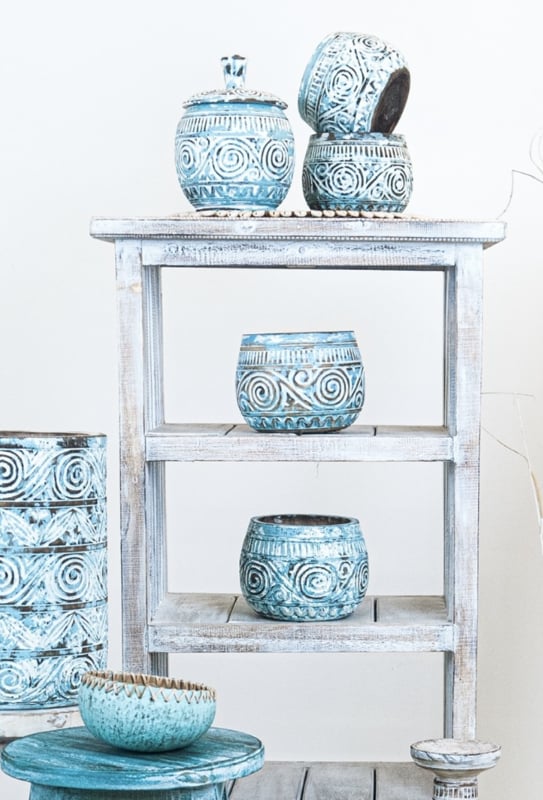 Holztopf mit Deckel, handgeschnitzt im Stammesstil, türkis/weiß/natur