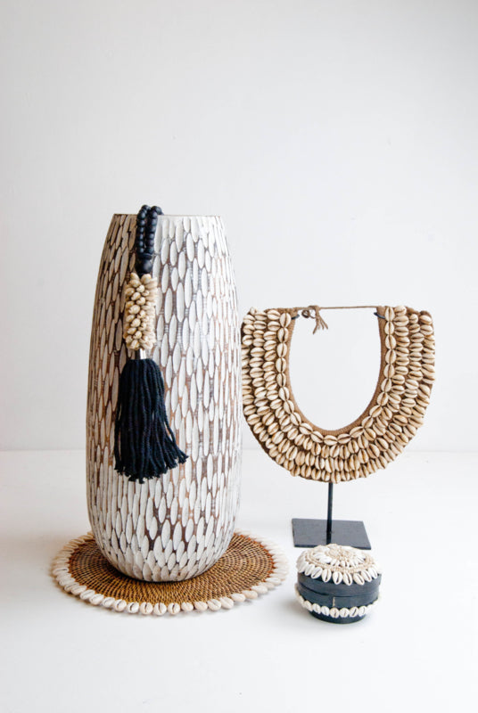 Diese dekorative Muschelkette mit schwarzen Holzperlen schafft eine wundervolle Atmosphäre.
