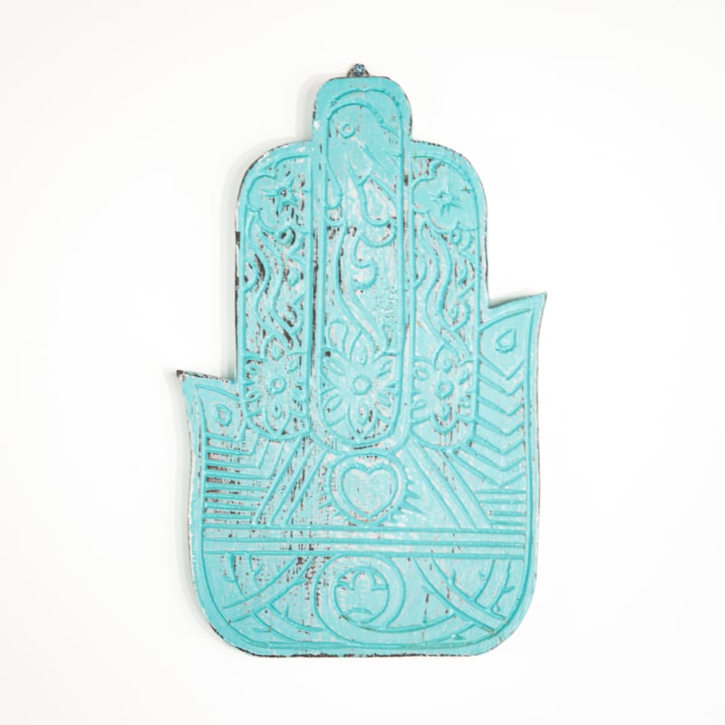 Beautiful, decorative, hand-carved wooden Fatima hand, 30cm, available in various colors. It comes with a hook for easy wall hanging. It also looks great on a cabinet, for example. The paint has been lightly sanded, revealing the natural wood tone.
