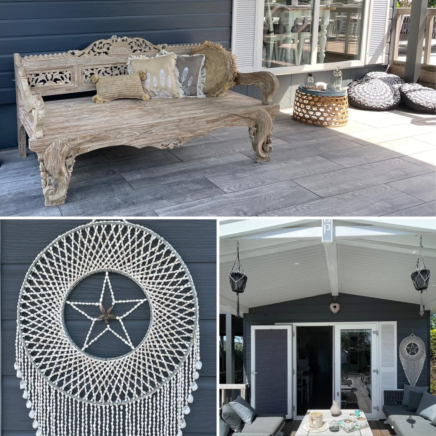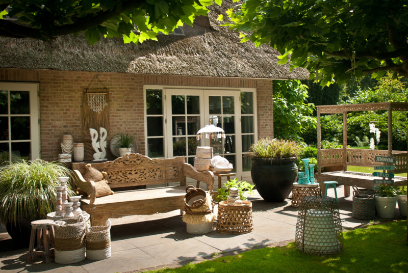 Prachtige Ibiza / Bali vakantiesfeer op een ruim terras. Meerdere zitplekken om op elke moment van de dag van de zon te kunnen genieten. Verschillende natuurlijke materialen creëeren een oase van rust.