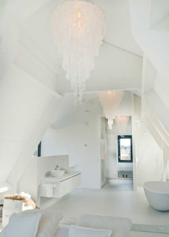 Dit was weer een mooi project! De witte schelpen geven naast een prachtig lichtspel een subtiel windgong geluid bij een briesje door deze open ruimte!
