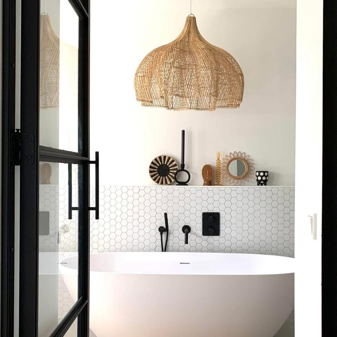 Modern zwart witte badkamer gecombineerd met natuurlijk neutrale elementen. Heerlijke sfeervolle en functionele verlichting.