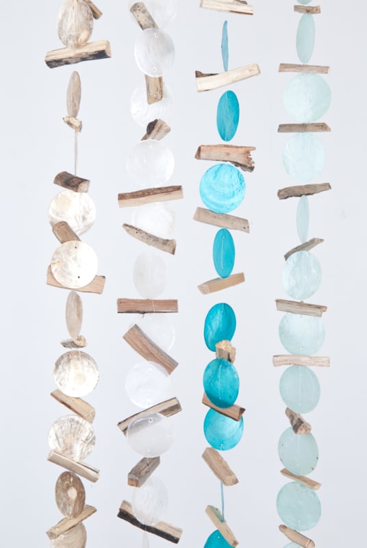 Capiz schelpen guirlande met driftwood houtjes in diverse kleuren.