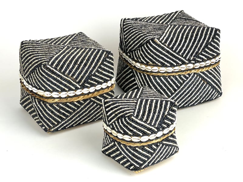 Prachtige bamboe offermand afgewerkt met kraaltjes en schelpjes in een antraciet/wit patroon.