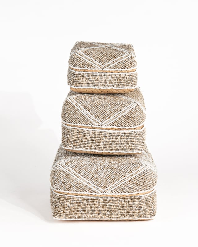 Prachtige set bamboe offermandjes laag model afgewerkt met kraaltjes in een creme/wit patroon.